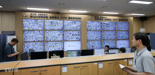 CCTV로 사전투표함 감시하는 선관위 제21대 대통령 선거를 이틀 앞둔 1일 경기 과천시 중앙선거관리위원회 사전투표함 보관장소 폐쇄회로(CC)TV 통합관제센터에서 직원들이 업무를 보고 있다. 이준헌 기자 |
