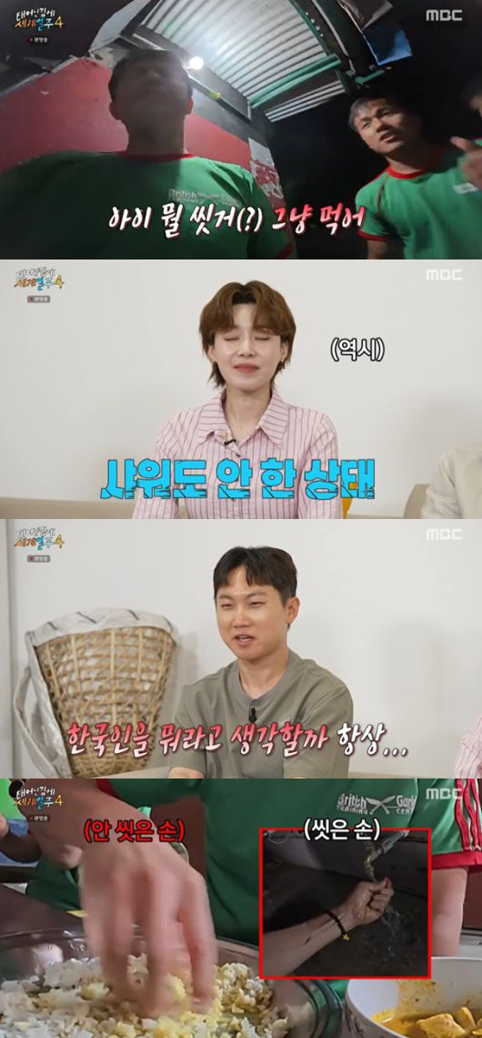 기안84는 "손에 나트륨이 있다"고 말했고, 이내 수돗가에 가서 손을 씻었다. 하지만 왼손만 대충 씻는 모습을 보였다.