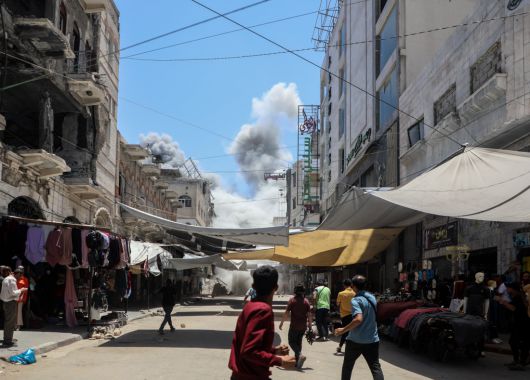 피어오르는 공포 팔레스타인인들이 지난달 31일(현지시간) 가자시티에서 이스라엘이 공습한 이후 연기가 피어오르는 것을 지켜보고 있다. 신화연합뉴스 |