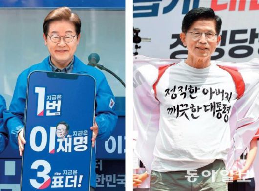 더불어민주당 이재명 대선 후보가 1일 대구 동대구역 광장에서 열린 유세에서 ‘1번 이재명 3표 더!’ 문구가 적힌 팻말을 들어 보이며 지지를 호소하고 있다. 이 후보는 역 광장에 있는 박정희 전 대통령 동상 앞에서 “이제 편 가르기 그만하자”며 통합을 강조했다. 국민의힘 김문수 대선 후보는 이날 서울 강남구 수도권 광역급행철도(GTX) 삼성역 공사장 앞에서 열린 유세에서 더불어민주당 이재명 후보의 방탄조끼를 비판하며 웃옷을 벗고 있다. 김 후보는 ‘정직한 아버지 깨끗한 대통령’ 문구가 적힌 티셔츠를 내보였다. 대구=이훈구 기자 ufo@donga.com, 장승윤 기자 |