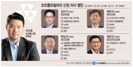 이사회 구성을 살펴보면 사내이사에 기존 이규호 부회장을 비롯해 올해 새롭게 선임된 강이구 코오롱모빌리티그룹 자동차 사업 부문 대표와 최현석 신사업 부문 대표가 합류했다.