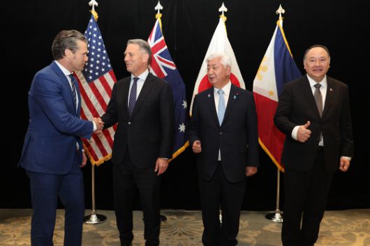 지난 31일(현지시간) 싱가포르에서 열린 아시아안보회의(샹그릴라 대화)에 참석한 장관들이 회담 후 한자리에 모였다. 왼쪽부터 피트 헤그세스 미국 국방장관, 리처드 말스 호주 부총리 겸 국방장관, 나카타니 겐 일본 방위상, 길베르토 테오도로 필리핀 국방장관. [EPA=연합뉴스] |
