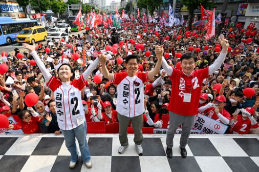 김 후보는 20·30 등 젊은 세대가 모인 은평구 연신내와 서대문구 신촌, 마포구 경의선 광장에선 투표를 적극 독려했다. 그는 “저는 머슴에 지나지 않는다”며 “제가 아무리 잘나도 여러분이 안 뽑아주면 저는 6월 3일부터 백수”라고 했다. 그는 이어 “도둑놈을 대통령으로 뽑을 것인가, 아니면 깨끗하고 능력 있는 사람을 뽑을 것인가”라고 반문했다.
