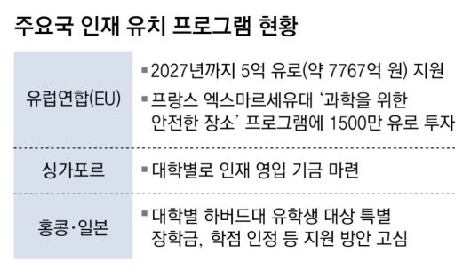이미 싱가포르는 주요 대학을 중심으로 인재 영입을 위한 자금을 마련하고 물밑 작업에 나섰다. 조남준 싱가포르 난양공대 재료공학과 교수는 “이미 하버드대와 스탠퍼드대에서 교수 2명이 오기로 했고, 추가적으로 협상하고 있는 교수도 있다”며 “대학 측에서 미국에서 빠져나오는 학생 및 연구자를 영입하기 위해 2700억 원 규모의 기부금을 마련하고 전략을 세우고 있는 상황”이라고 설명했다.