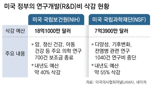 트럼프 행정부의 예산 삭감 조치로 NIH와 NSF는 각각 18억1000만 달러(약 2조5025억 원), 7억3900만 달러(약 1조220억 원)에 달하는 연구 보조금이 중단됐다. 지난해 단백질 3차원 구조를 예측하는 인공지능(AI) 개발에 기여해 노벨 화학상을 받은 데이비드 베이커 미국 워싱턴대 교수조차 해당 기관들로부터 받는 R&D 지원금이 크게 축소돼 일부 연구에 지장이 있는 것으로 알려졌다.