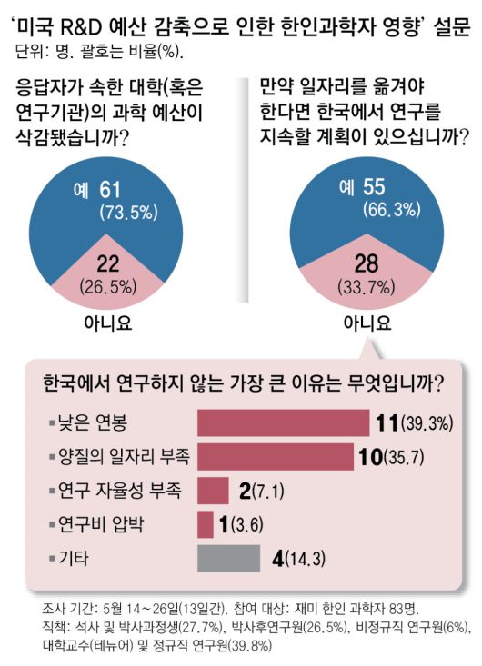 트럼프 행정부의 예산 삭감에 신분이 불안해진 것은 미국 내 한인 과학자들도 마찬가지다. 동아일보가 지난달 14∼26일 재미 과학자를 대상으로 설문 조사한 결과, 전체 응답자 83명 가운데 소속 기관에 예산 삭감이 이뤄진 경우는 73.5%(61명)에 달했고, 47.0%(39명)가 예삭 삭감으로 일자리 위협을 느낀다고 답했다. 정규직 연구원이거나 종신직(테뉴어) 대학 교수를 제외한 응답자가 50명(60.2%)인 것을 감안하면 비정규직 재미 과학자의 약 80%가 일자리를 잃을 위기에 처한 것이다.