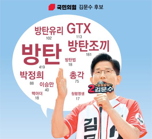 분석 기간 동안 김 후보는 ‘방탄’을 419회 언급했다. ‘방탄조끼’(181회), ‘방탄유리’(102회), ‘방탄법’(18회) 등도 자주 언급했다.