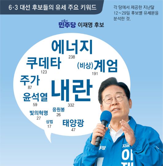 이 후보는 분석 기간 동안 유세에서 ‘내란’을 총 332번, ‘계엄’ 및 ‘비상계엄’을 191번, ‘쿠데타’를 123번, ‘총칼’을 35번 언급했다. ‘빛의 혁명’(27회) ‘응원봉’(26회) 등 12·3 비상계엄 사태 및 윤석열 전 대통령 탄핵 정국에서 국민의 역할을 강조하는 단어도 자주 사용했다. 지지를 호소할 때도 “투표는 총알보다 강하다” 등 비상계엄 사태에 맞서는 이미지를 자주 사용했다.