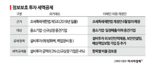 법안은 2018년에 일몰된 정보보호 투자 세액공제와 비슷한 내용이 담길 것으로 보인다. 일몰된 법은 보안서버·침입탐지시스템·백업장비 같은 설비를 새로 구입한 중소·중견기업이 대상이었다. 이들은 투자금액의 3%(상장기업의 경우 4%)를 해당 과세연도의 법인세 또는 소득세에서 직접 공제받을 수 있었다.