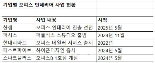 사무가구 1위 기업인 퍼시스(016800)도 오피스 인테리어 사업에 박차를 가하고 있다. 퍼시스는 지난 2021년부터 공간사업부를 조직해 기업 고객에 오피스 인테리어 서비스를 제공해 왔다. 지난해 11월에는 오피스 인테리어 전문 브랜드 ‘퍼플식스 스튜디오’를 출범하며 사업에 고삐를 죄고 있다.