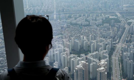 지난달 26일 서울 송파구 롯데월드타워 전망대 ‘서울스카이’에서 한 시민이 서울 시내 아파트단지 일대를 바라보고 있다. 뉴시스 |