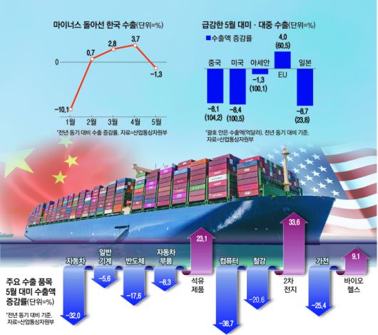 무역전쟁 심화에 따라 한국이 최대 수출 실적을 올리는 중국 시장까지 수출이 부진한 모습을 나타내고 있다. 한국의 대중 수출액은 1월 -13.9%, 2월 -1.4%, 3월 -4.4%로 줄어들다가 지난 4월에 수출액이 3.9% 늘며 깜짝 반등했다. 하지만 5월 대중국 수출액은 또다시 8.4% 급감했다.