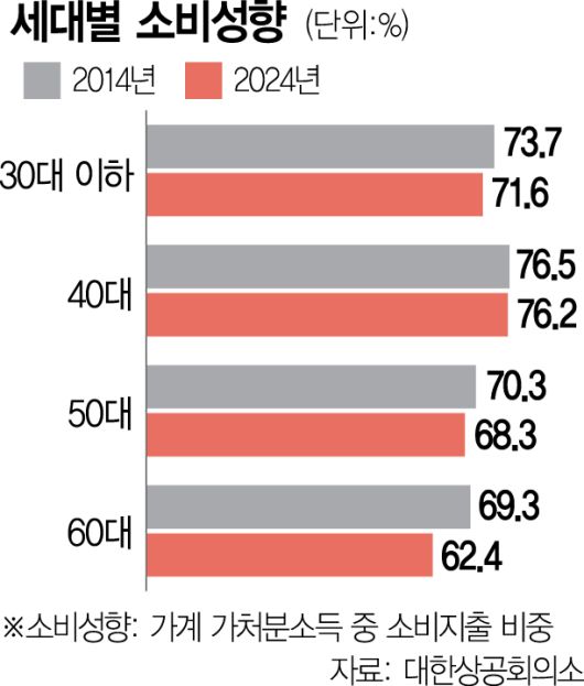 10년 전과 비교해 30대 이하를 제외한 모든 세대에서 소득이 늘었지만 소비지출은 이에 비례해 증가하지 않았다. 가계 가처분소득 중 소비지출이 차지하는 비중인 평균소비성향은 2014년 73.6%에서 2024년 70.3%로 3.3%포인트 하락했다.