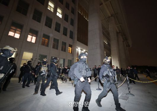 윤석열 전 대통령이 비상계엄을 선포한 이튿날인 지난해 12월4일 계엄군이 서울 여의도 국회의사당 본청 앞을 점거하고 있다. 성동훈 기자 |