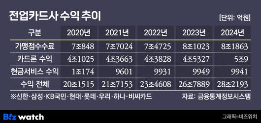 더욱이 카드업계는 본업인 신용판매에서 고전을 면치 못하고 있다. 특히 가맹점 수수료 수익은 절대 수치는 늘어났지만, 전체 수익에서 차지하는 비중은 지속적으로 하락하고 있다. 2020년에는 전체 수익의 35%를 차지하던 가맹점 수수료가 2024년에는 29%로 떨어졌다. 이는 적격비용 재산정으로 인해 중소가맹점 수수료 우대 수수료가 작용한 결과다.