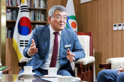 ◇김학동 예천군수가 예천군청에서 가진 스포츠조선과의 인터뷰에서 현재 의욕적으로 추진중인 'e스포츠 국가대표 훈련센터'의 필요성과 향후 계획을 설명하고 있다. 사진제공=예천군 |