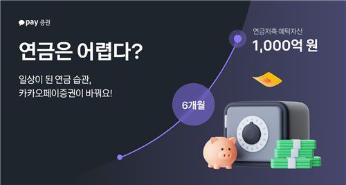 (서울=연합뉴스) 곽윤아 기자 = 카카오페이증권은 연금저축 계좌 예탁자산이 지난달 4일 기준 1천억원을 돌파했다고 2일 밝혔다.