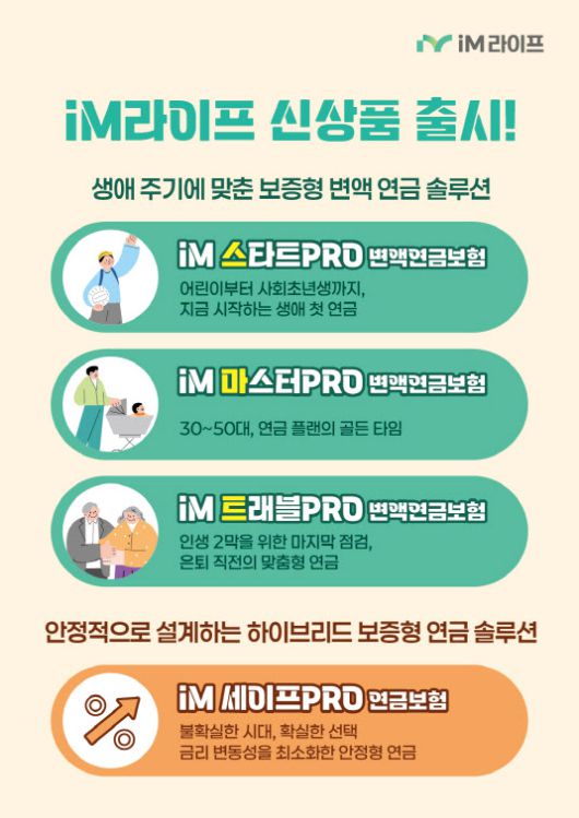 이에 따라 iM라이프는 △iM스타트PRO변액연금보험 △iM마스터PRO변액연금보험 △iM트래블PRO변액연금보험 △iM세이프PRO연금보험 등 4종을 새롭게 선보인다. iM라이프는 상품 세분화를 통해 연령별 특성과 니즈를 반영한 맞춤형 연금 솔루션을 제공해 업계 최초로 전 생애주기를 아우르는 연금 라인업을 완성했다.