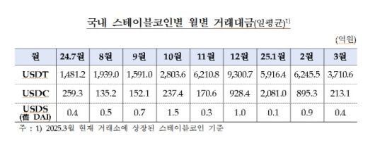 [이데일리 이정윤 기자] 올해 1분기 국내 가상자산 거래소에서 거래된 스테이블코인 규모가 57조원에 달했다. 스테이블코인은 미국 달러화 등 법정 화폐와 연동해 가치를 안정적으로 유지하는 것을 목표로 하는 가상자산이다.