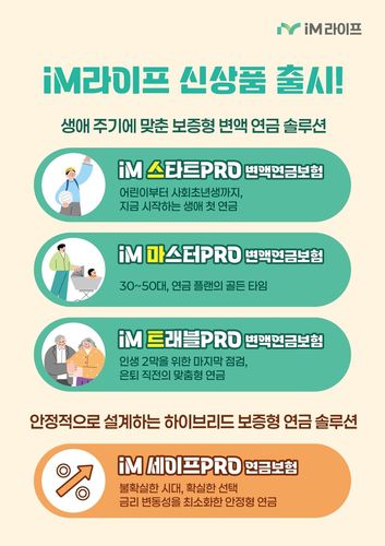사회 초년생을 위한 iM스타트 프로, 30∼50대를 위한 iM마스터 프로, 은퇴를 준비하는 시기를 위한 iM트래블 프로 변액연금보험은 최대 40년간 7% 단리, 이후 5% 단리로 부리된 연금액 보증을 통해 안정적인 노후 자금 마련을 지원한다.