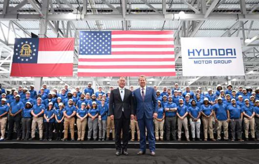 블룸버그통신은 지난달 29일(현지시간) 보도를 통해 현대차가 6월부터 전 차종의 권장 소비자 가격(MSRP)을 1% 인상하는 방안을 검토하고 있다고 전했다. 정의선 현대자동차그룹 회장과 브라이언 켐프 미국 조지아 주지사가 지난 3월 현대차그룹 메타플랜트 아메리카(HMGMA) 준공식에서 기념사진을 촬영하고 있는 모습. /현대차그룹 |