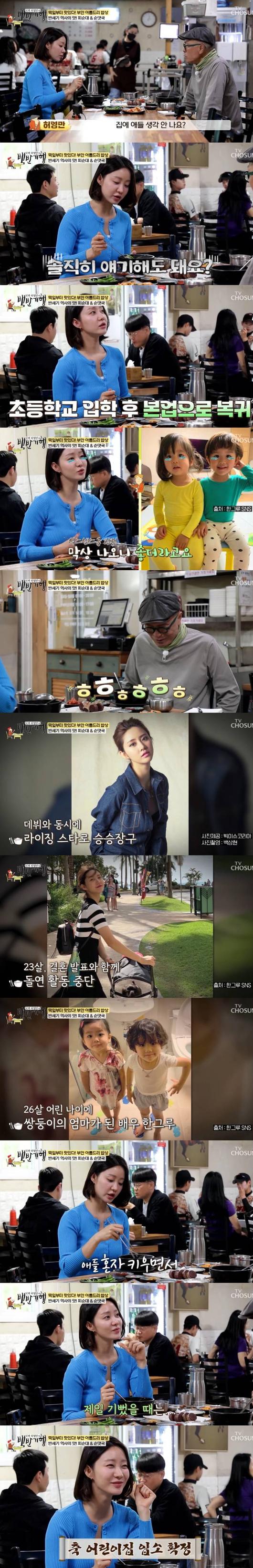 허영만은 "무서운 엄마네"라고 너스레를 떨었고, 한그루는 "제가 애들 학교 들어가고부터 일을 했다. 그때까지는 한번도 떨어져 자본 적도 없고 제가 목욕시키고 밥 해먹이고 다했다. 그러다 보니까 처음으로 나온 날엔 서로 울었는데 막상 나오니까 좋기도 하더라"라고 이야기했다.