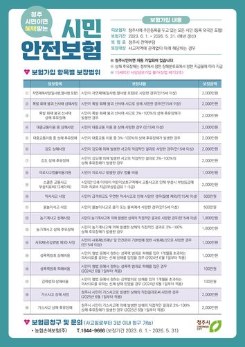청주에 주소를 둔 시민(등록외국인 포함)은 자동 가입된다. 항목별로 최대 2천만원까지 보상받을 수 있다.