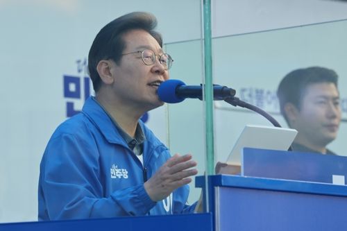 이재명 더불어민주당 대선 후보가 지난 1일 부산광역시 부산역광장에서 연설을 하고 있다. [사진 출처 = 연합뉴스] |