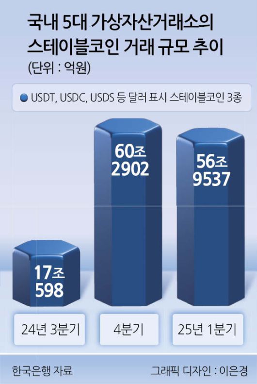 5대 거래소의 스테이블코인 거래 규모는 지난해 3분기 17조598억원에서 4분기 60조2902억원으로 3배 넘게 늘어났다. 이후 올해 1분기에도 비슷한 수준을 유지했다.