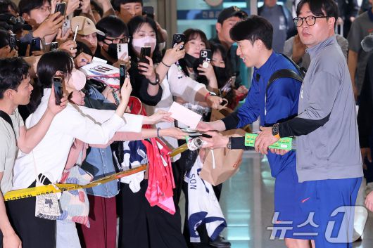 이재성을 비롯한 축구 국가대표팀 선수들이 2일 이라크전 원정경기를 하기 위해 인천국제공항을 통해 출국하고 있다. 대한민국 축구대표팀은 6일 오전 3시15분(한국시간) 이라크와 2026 국제축구연맹(FIFA) 북중미 월드컵 아시아 3차 예선 B조 경기를 치른다. 2025.6.2/뉴스1 ⓒ News1 박세연 기자 |