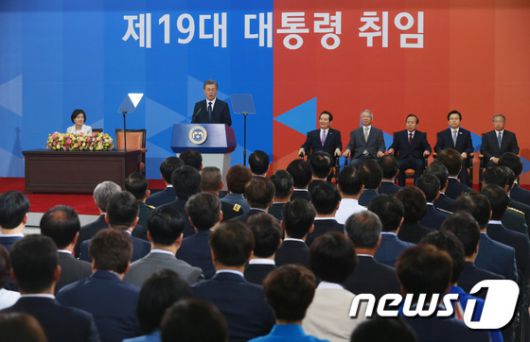 문재인 전 대통령이 서울 여의도 국회 본관 로텐더홀에서 열린 제19대 대통령 취임식에서 취임사를 하고 있다. 2017.5.10/뉴스1 ⓒ News1 국회사진취재단 |