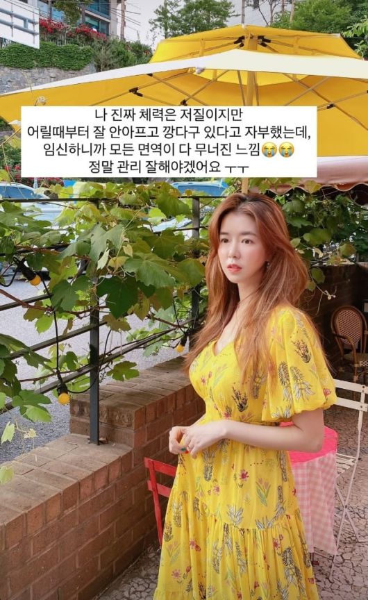 김지혜는 지난 1일 자신의 인스타그램 스토리에 "나 진짜 체력은 저질이지만 어릴 때부터 잘 안 아프고 깡다구 있다고 자부했는데, 임신하니까 모든 면역이 다 무너진 느낌"이라며 "정말 잘 관리해야겠어요"라는 글과 함께 한 장의 사진을 게재했다.