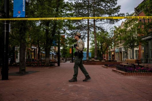 1일 미국 콜로라도주 볼더 시에서 친이스라엘 단체를 노린 테러 공격이 발생한 뒤, 사고가 난 거리 주변을 경찰이 순찰하고 있다. AFP 연합뉴스 |