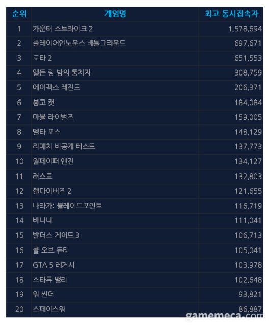 ▲;6월 2일 정오 기준 스팀 일 최고 동시접속자 TOP 20 (자료출처: 스팀) |