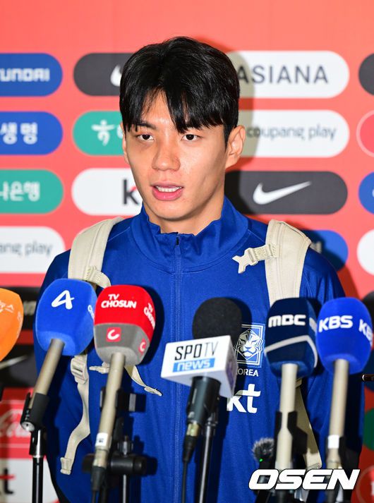 [OSEN=인천공항, 김성락 기자] 대한민국 축구 국가대표팀이 6일 오전 3시 15분(한국시간) 이라크와2026 국제축구연맹(FIFA) 북중미 월드컵 아시아 3차 예선 B조 경기를 치르기 위해 이라크 원정 출국길에 올랐다.한국은 B조에서 선두(4승 4무, 승점 16)를 달리고 있다. 2위는요르단(승점 13), 3위는 이라크(승점 12). 홍명보호는 남은 2경기에서 승점 1만 추가하면 11회 연속 본선 진출을 확정한다.축구대표팀 전진우가 취재진의 질문에 대답하고 있다. 2025.06.02 / ksl0919@osen.co.kr |