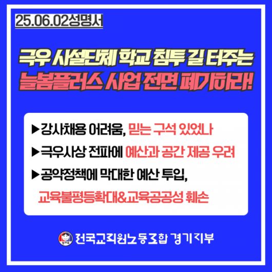 전교조 경기지부는 이날 성명서를 통해 “언론 보도를 통해 들어난 것과 같이 정부와 교육청이 추진하는 ‘늘봄학교’ 정책 아래 ‘극우 사설단체’들이 늘봄학교를 활용한 초등학교 우파 침투 전략을 치밀하게 계획한 것으로 보인다”며 “경기도교육청의 ‘2025년 여름방학 늘봄플러스’ 사업이 이들의 활동 공간을 사실상 확장시키는 결과를 초래할 것에 대해 우려를 금치 못한다”고 말했다.