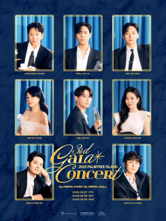 뮤지컬 배우 김준수, 김소현, 정선아, 손준호, 정원영, 서경수, 진태화, 임규형이 소속된 팜트리아일랜드의 ‘2025 PALMTREEISLAND 3rd GALA CONCERT’는 오는 6월 27~29일 사흘간 서울 송파구 올림픽공원 올림픽홀에서 개최되며 추가 티켓 예매는 6월 5일(목) 오후 2시부터 티켓 예매처 NOL 티켓(구 인터파크 티켓)에서 진행된다.