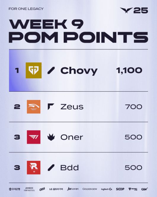 ▲ 2025 LCK 정규 시즌 9주 차 POM 순위