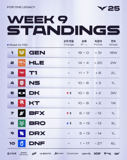 ▲ 2025 LCK 정규 시즌 9주 차 팀 순위