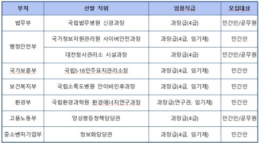 민간의 경험과 전문성을 적극 활용할 수 있는 분야를 중심으로 각 부처가 지정해 민간 전문가만 지원할 수 있는 경력개방형 직위는 ▲행안부 국가정보자원관리원 사이버안전과장 ▲보훈부 국립5.18민주묘지관리소장 ▲복지부 국립소록도병원 안이비인후과장 ▲환경부 국립환경과학원 환경에너지연구과장 ▲중기부 정보화담당관 등 5개다.