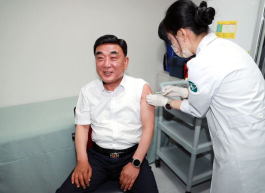 여름철을 앞두고 코로나19 유행이 우려되는 가운데 김두겸 울산시장이 고위험군의 예방 접종을 독려하기 위해 2일 울산 남구보건소에서 코로나19 백신을 접종하고 있다. |