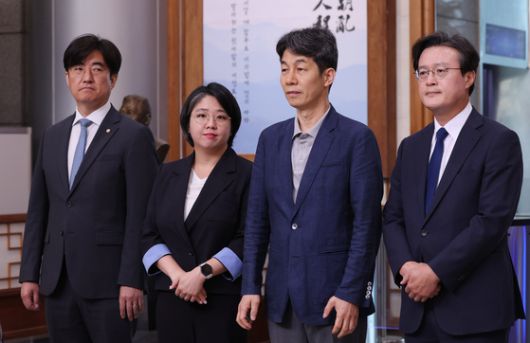 윤건영 더불어민주당 의원을 비롯한 국회 행정안전위원회 소속 의원들이 지난 1일 오전 서울 서대문구 경찰청에서 댓글 부대 운영 리박스쿨 관련 항의 방문을 마친 뒤 자리를 옮기고 있다. 왼쪽부터 김성회, 용혜인, 윤건영, 채현일 의원. 뉴스1 |