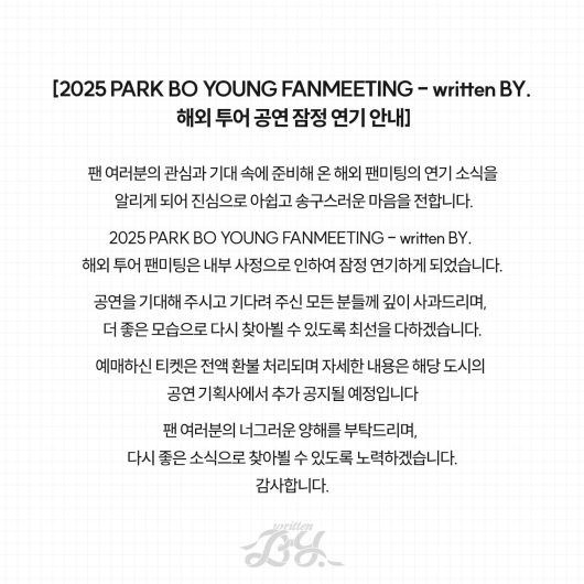 [2025 PARK BO YOUNG FANMEETING - written BY. 해외 투어 공연 잠정 연기 안내]