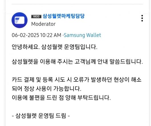 그러면서 "삼성페이 결제 오류의 원인은 일부 카드사와 전용선 네트워크 장애로 발생했다"고 설명했다.