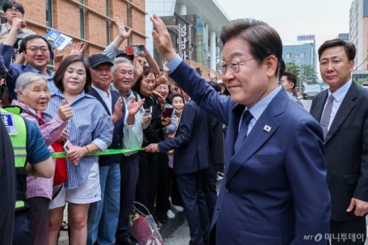 (성남=뉴스1) 안은나 기자 = 이재명 더불어민주당 대통령 후보가 제21대 대통령선거를 하루 앞둔 2일 오후 경기 성남시 주민교회에서 기자회견을 마친 뒤 성남시의료원 앞에 대기하고 있던 시민들과 인사를 나누고 있다. 2025.6.2/뉴스1 Copyright (C) 뉴스1. All rights reserved. 무단 전재 및 재배포, AI학습 이용 금지. /사진=(성남=뉴스1) 안은나 기자 |
