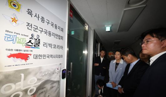 더불어민주당 중앙선거대책위원회 신속대응단 정준호 부단장과 의원들이 지난달 31일 서울 종로구에 위치한 ‘리박스쿨’에 항의방문하고 있다. 연합뉴스 |