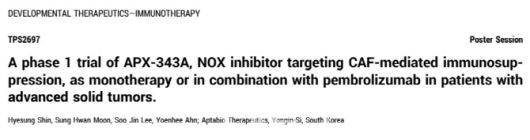 27일 압타바이오에 따르면 오는 6월 2일 미국 시카고에서 열리는 ASCO에서 압타바이오가 APX-343A의 임상 1상 프로토콜로 포스터 발표를 진행할 예정이다. 관련 초록은 이미 지난 22일 공개됐다.