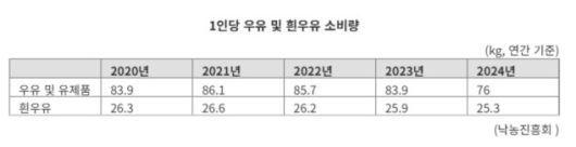 우리나라 1인당 연간 흰우유 소비량은 2020년 26.3㎏에서 정체와 감소를 반복하며 2024년에는 25.3㎏으로 줄었다. 가공유, 유제품 등을 포함한 우유 제품 전체 소비량도 이 기간 83.9㎏에서 76㎏으로 줄었다.