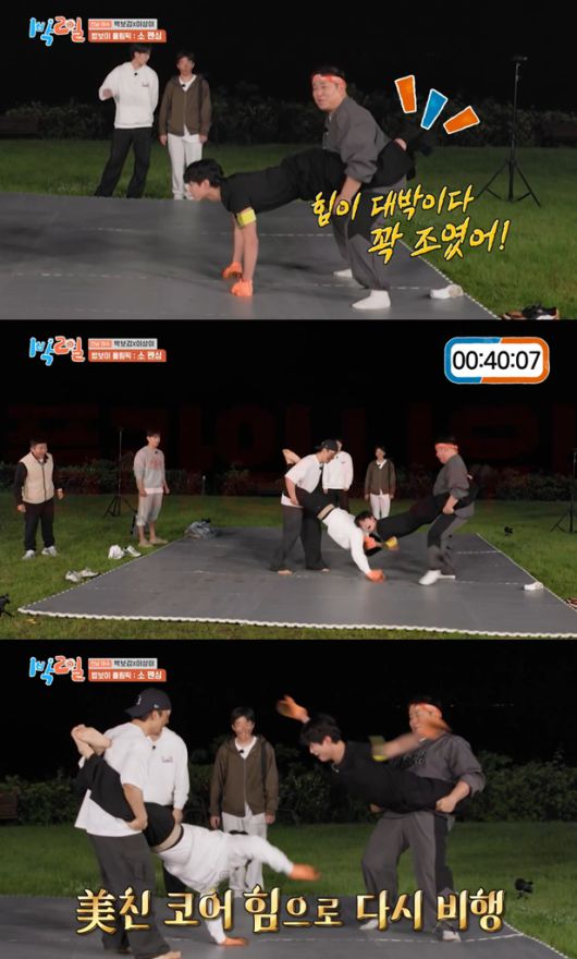 박보검과 같은 팀을 이룬 문세윤은 "혹시 기립근 힘이 괜찮냐. 내가 다리를 잡으면 뜰 수 있겠냐"고 물었고, 박보검은 "해보겠다"고 답했다.