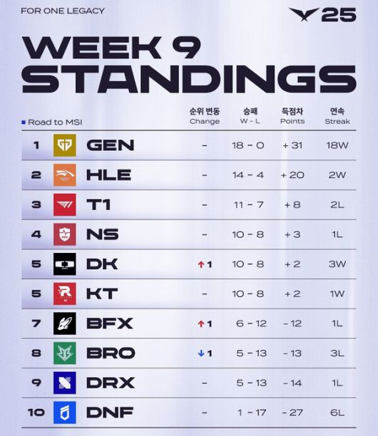 8주 차를 마친 시점에 LCK MSI 대표 선발전에 출전할 6개 팀이 모두 정해지면서 9주 차 최고의 관심사는 농심 레드포스, kt 롤스터, 디플러스 기아 가운데 어떤 팀이 6위에 랭크되느냐였다. 2025년 LCK는 정규 시즌 1, 2라운드를 마친 순위에 따라 1위부터 5위까지는 레전드 그룹, 6위부터 10위까지는 라이즈 그룹으로 나누어 3~5라운드를 소화하기 때문이다.